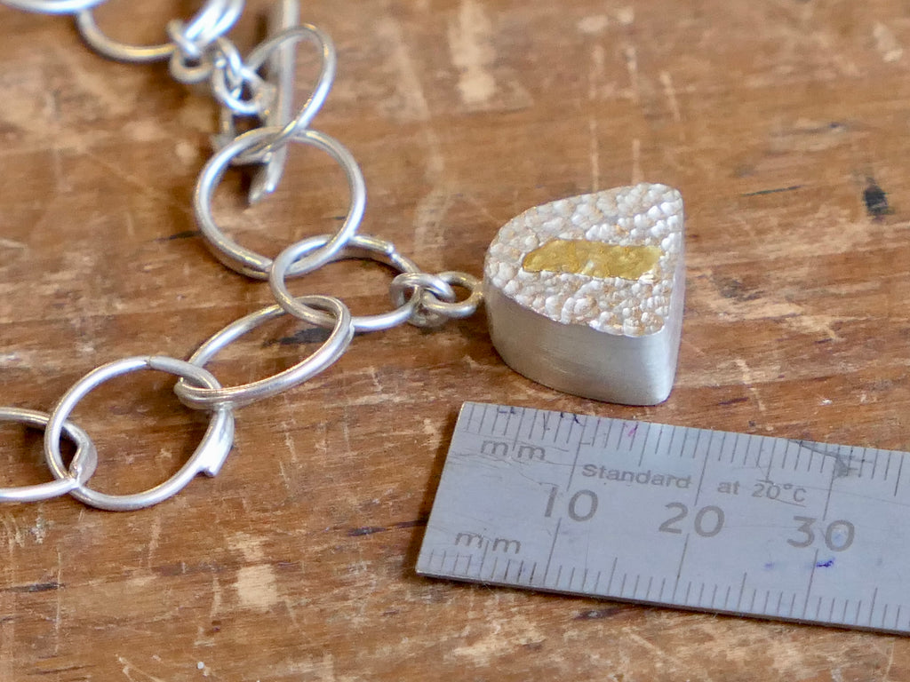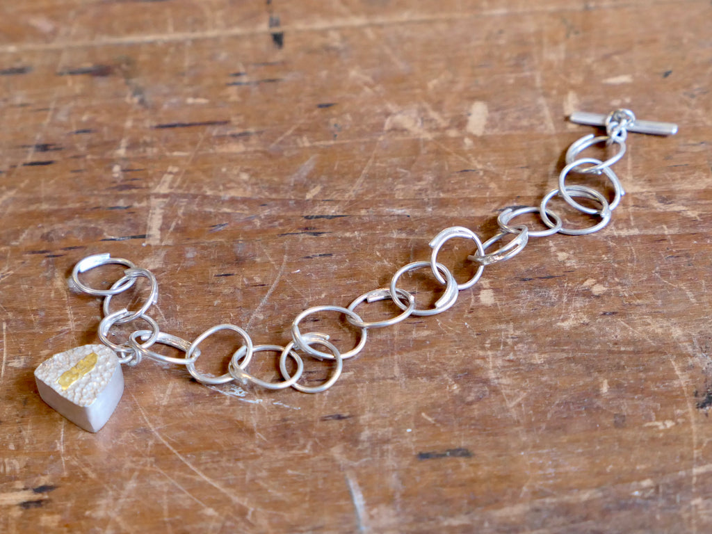 Handmade and unique. A gorgeous chunky link sterling silver charm bracelet composed of handmade links and T-bar fastening, and adorned with a chunky sterling silver charm. One surface of the charm has been reticulated and adorned with 24ct gold foil detail .