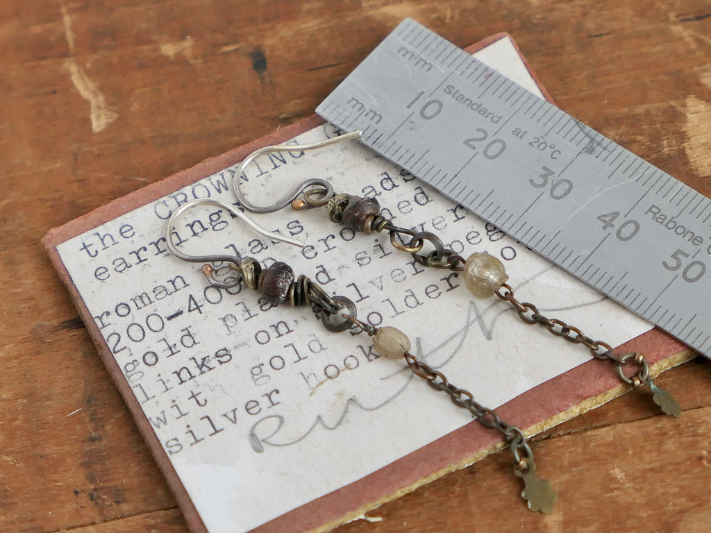 Handmade and unique. These gorgeous earrings are composed of Roman glass beads crowned with gold plated silver chain links on silver pegs with gold silver dots on recycled sterling silver hooks.