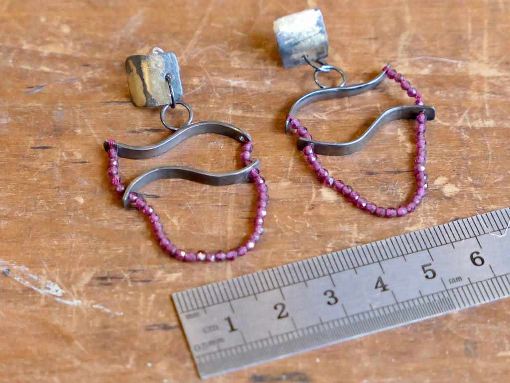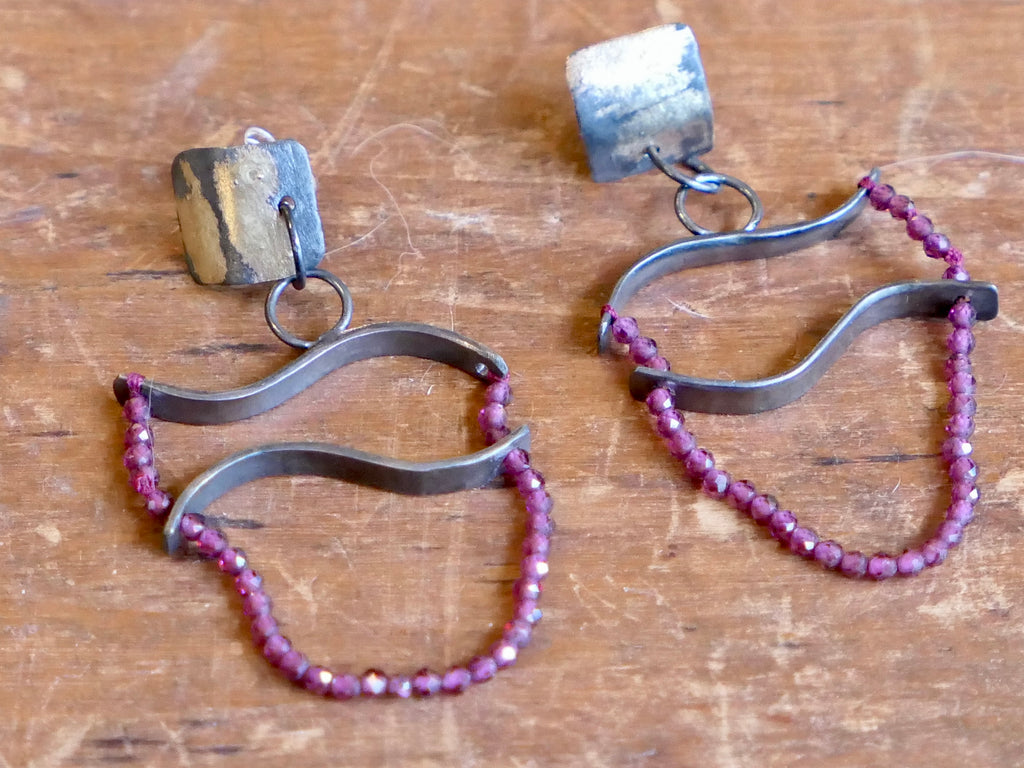 Handmade and unique. Striking drop earrings featuring stylised fish in oxidised silver with beautiful, faceted garnet beads, which catch the light as they move. They have a square, oxidised silver top section, which sits on the ear and is adorned with gold leaf detail.