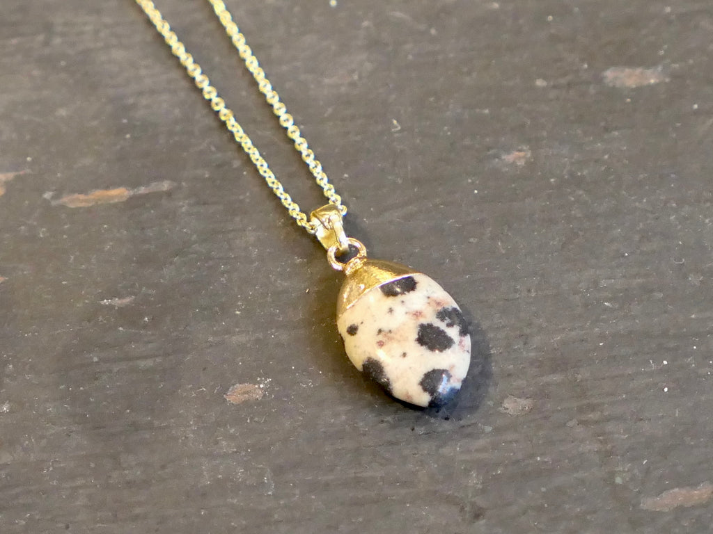 An oval Dalmatian jasper gemstone with gold plated accents. Looks great layered with other necklaces.