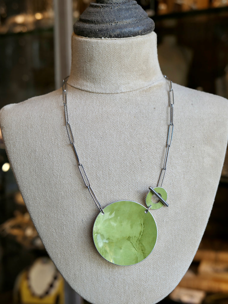 Handmade and unique. Printed aluminium disk, curved and hung on a stainless steel paperclip chain with bar and hoop fastening. Sits just below collar bone.