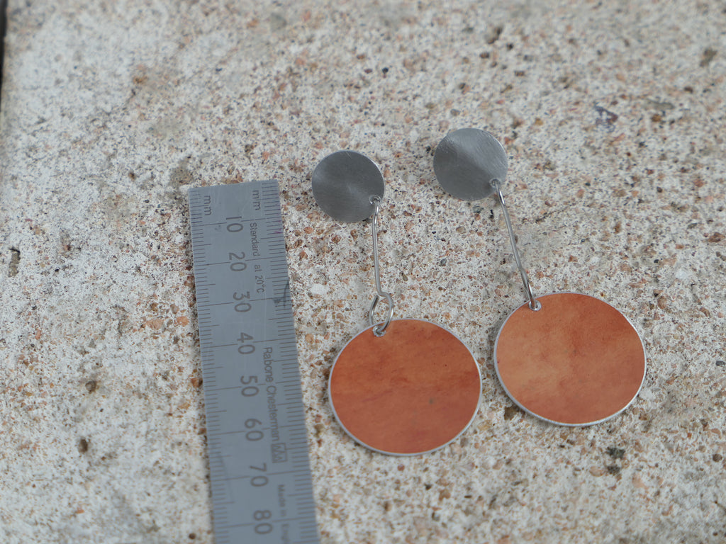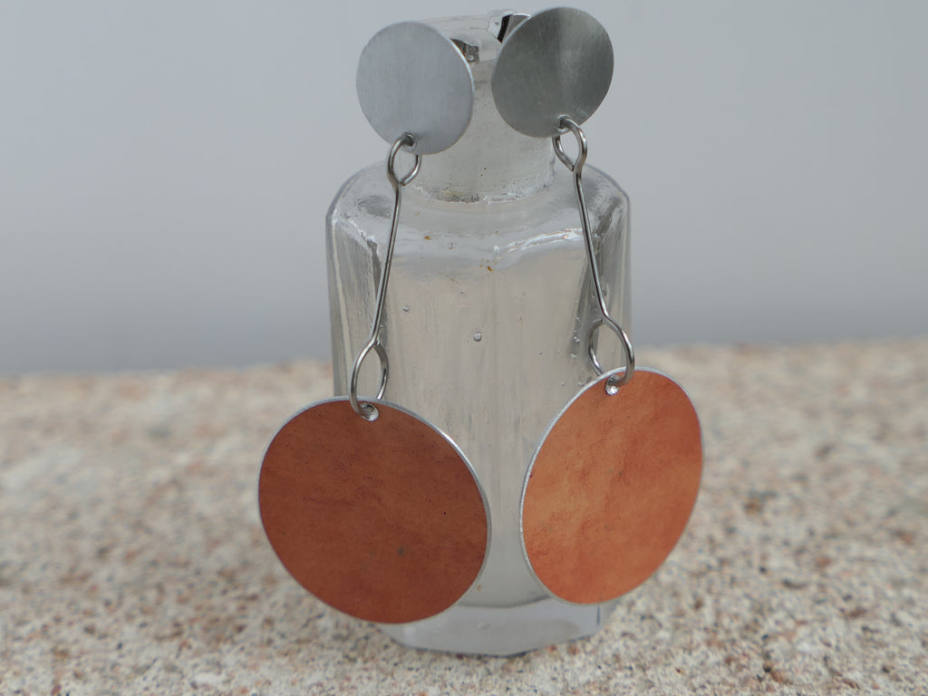 Printed aluminium disk suspended from a smaller aluminium disk with stainless steel post and scroll. Top disk internal diameter 16mm. Bottom disk internal diameter 30mmTotal drop 70mm