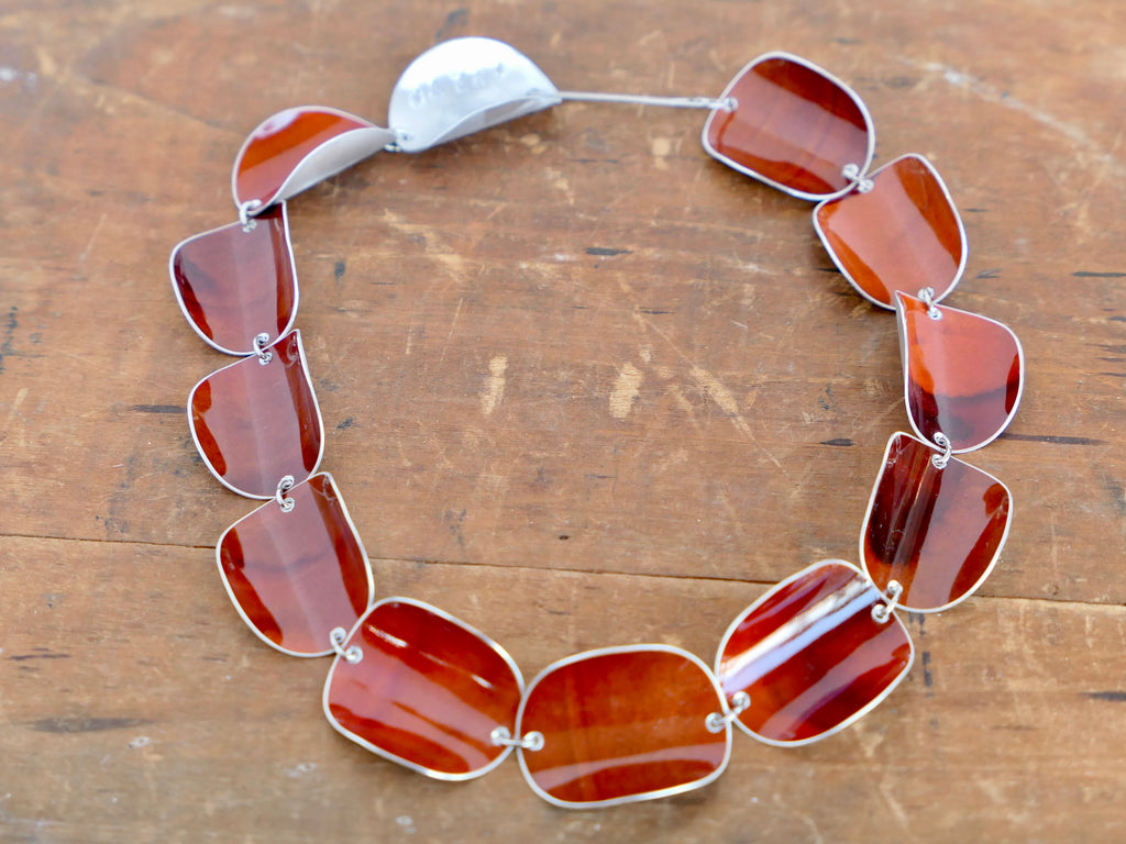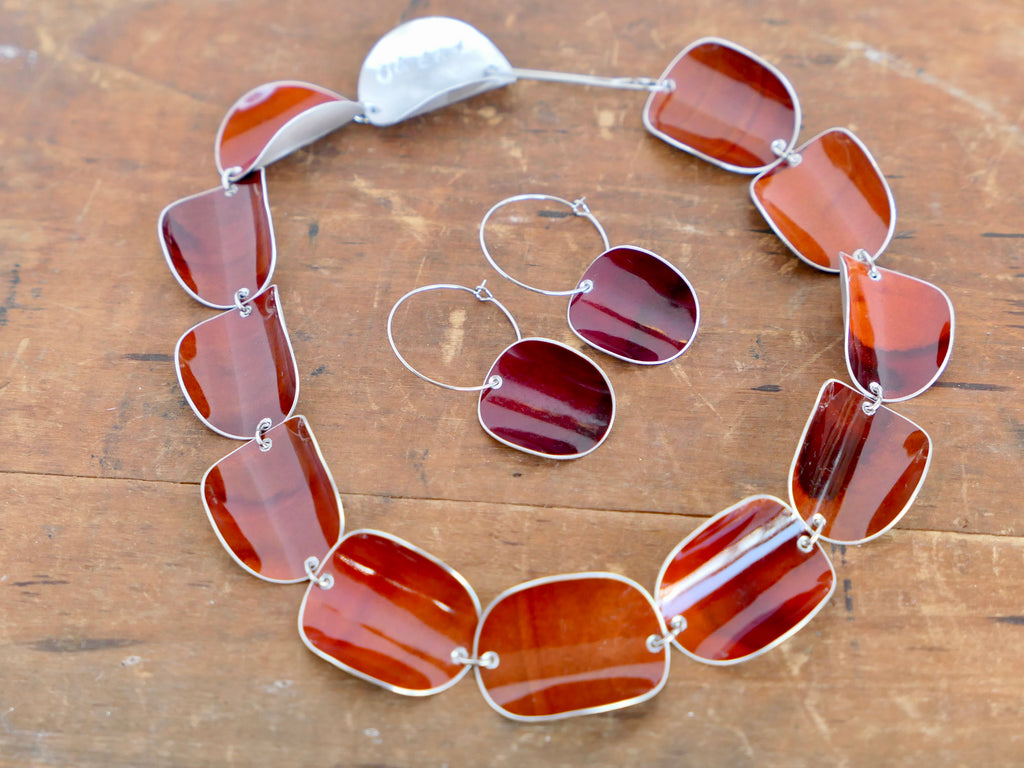 Handmade and unique. Printed aluminium curved disks with stainless steel bar and hoop fastening.