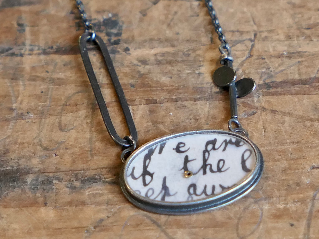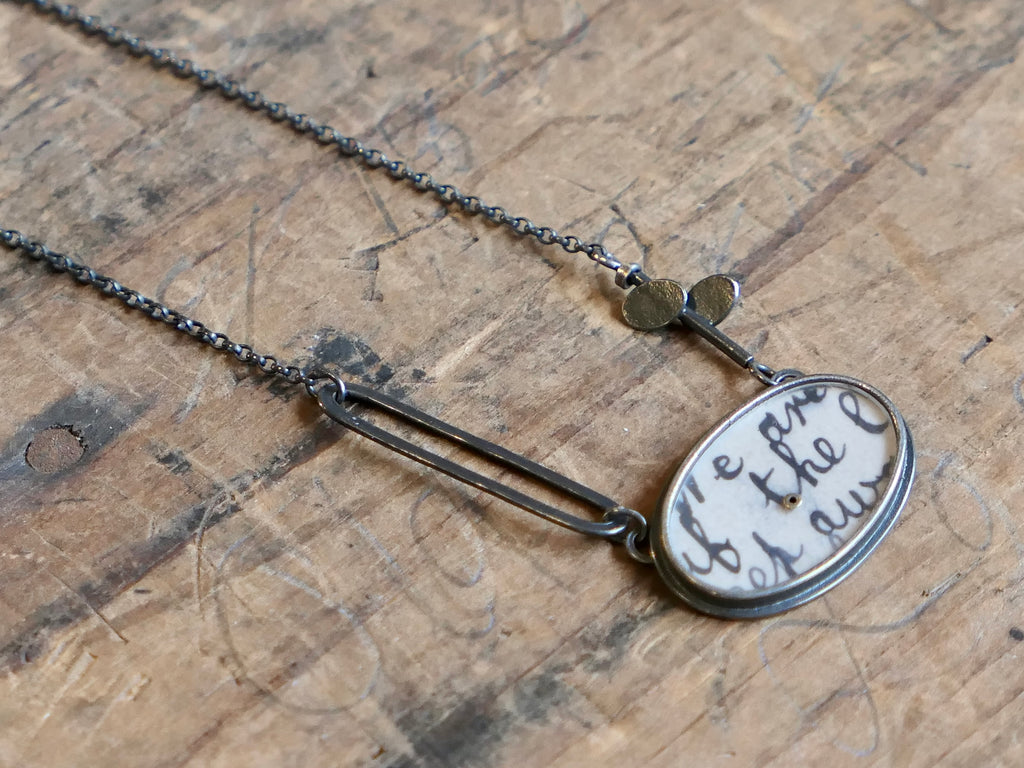 This necklace features a central oval setting with a postcard fragment sitting between a lozenge link on one side, and a stick and ovals on the other side.