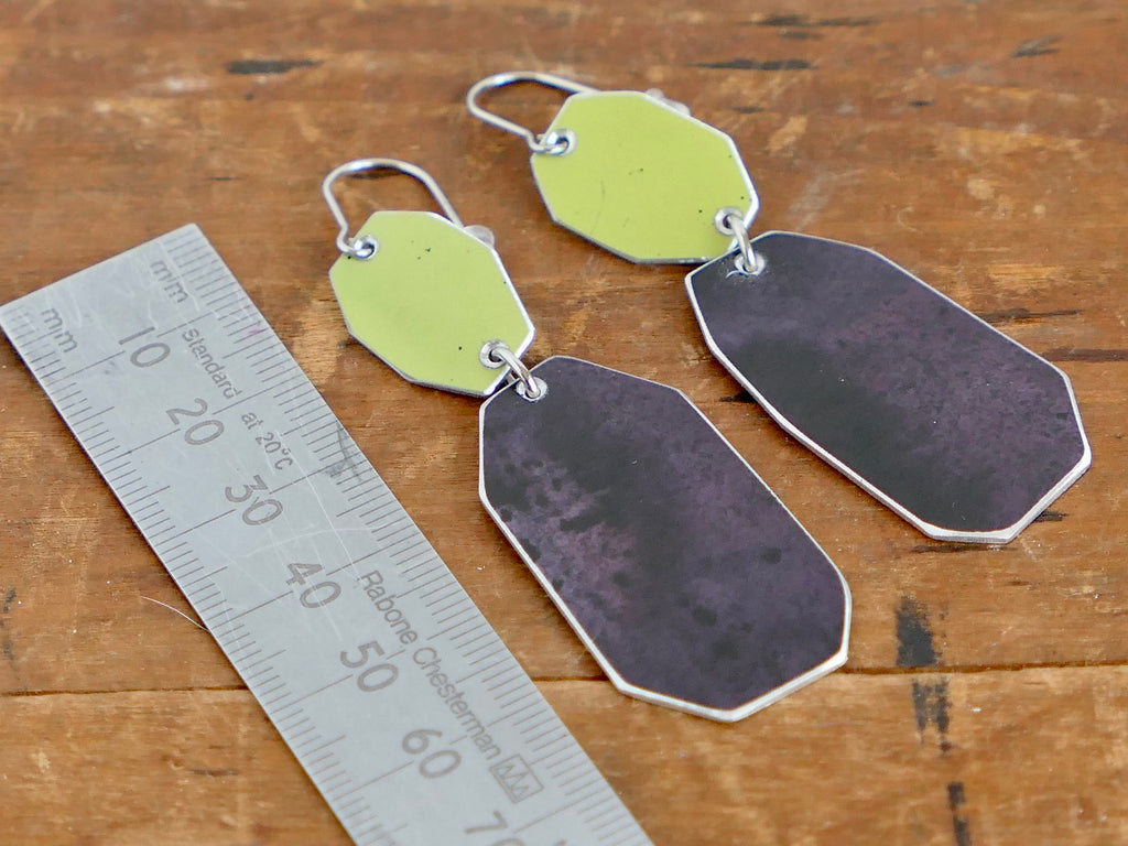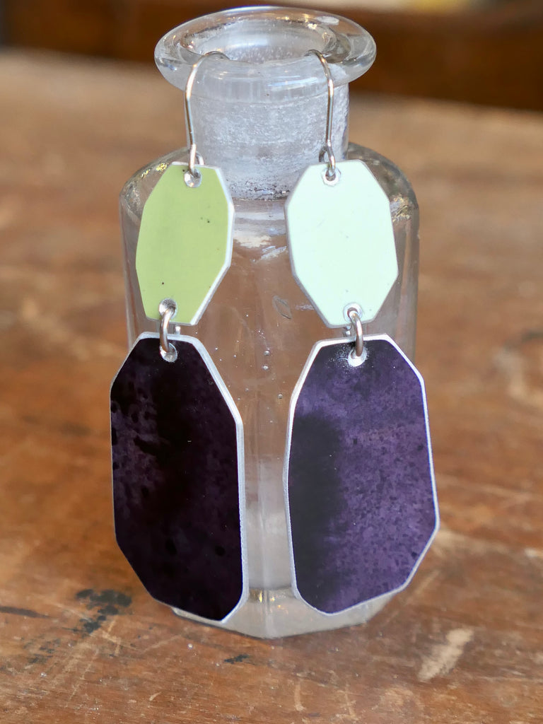 Handmade and unique. Printed aluminium, hand cut pieces hung on a stainless steel ear wire.