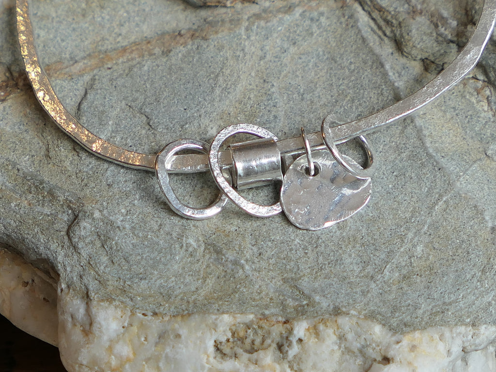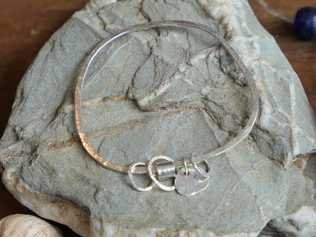 Lovely little charm bangle made from planished 2mm eco silver. It features a silver pebble ,  a silver scroll and three small hammered silver ovals.