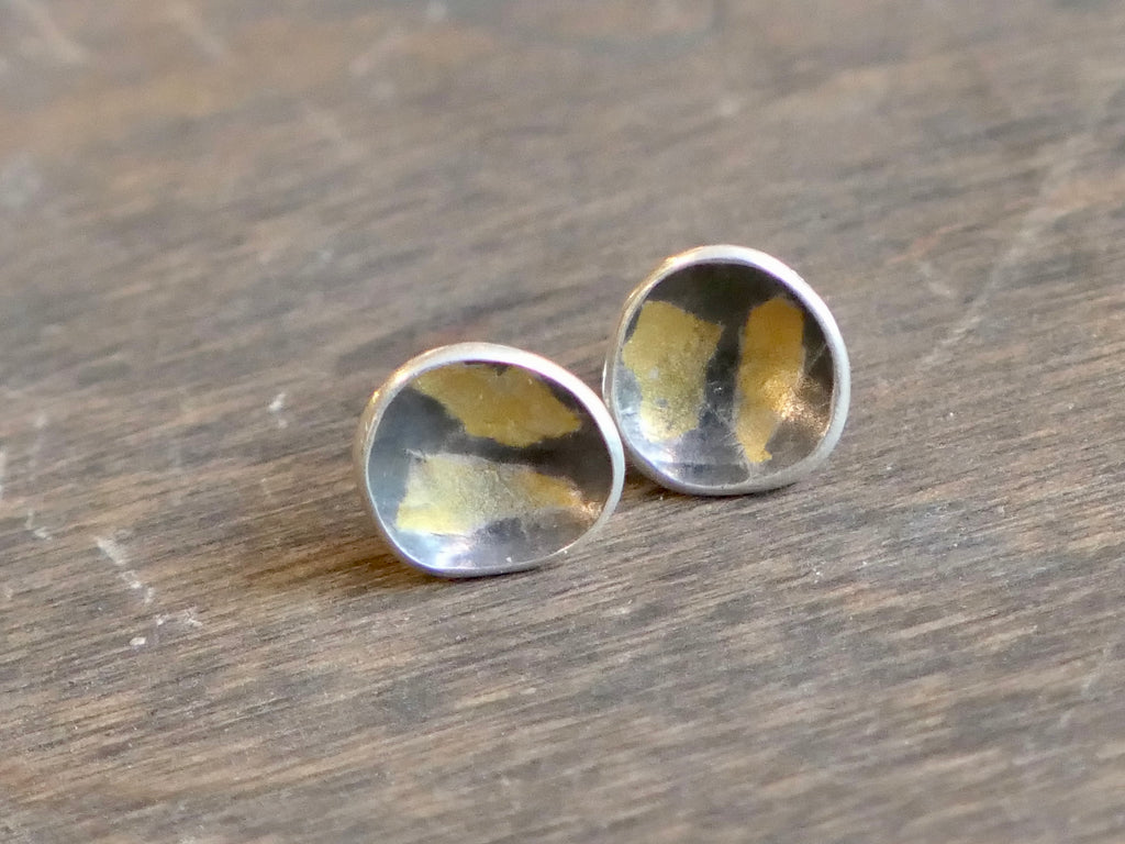 The earrings measure approximately 10mm in diameter. Each stud is made from silver which has been melted down and hammered out using old tools giving it that organic shape and finish.
